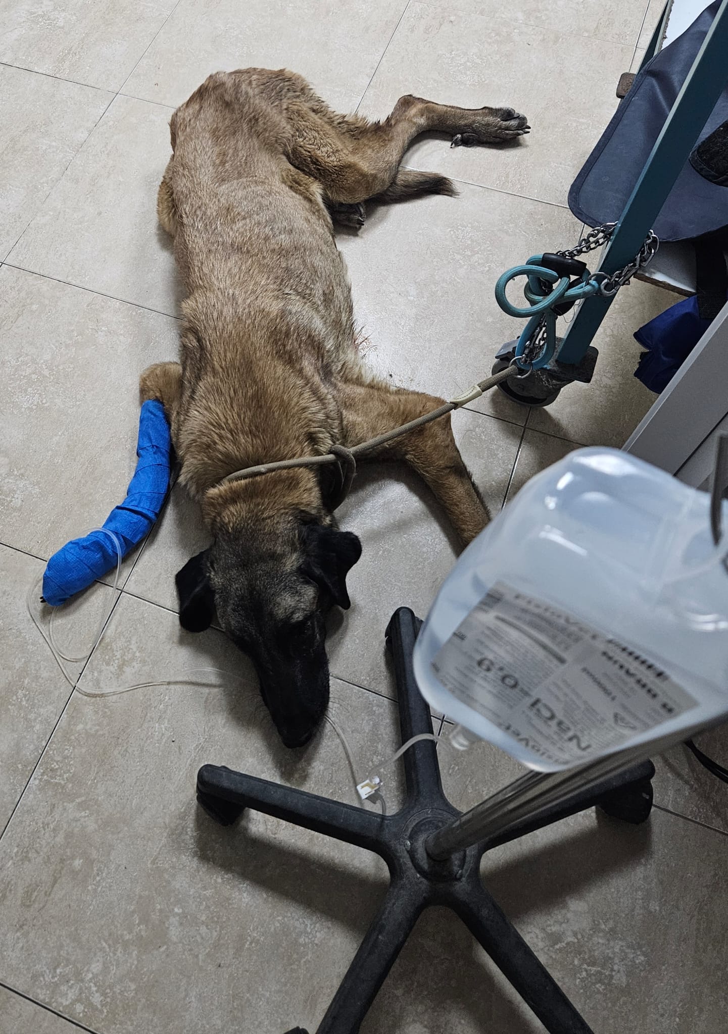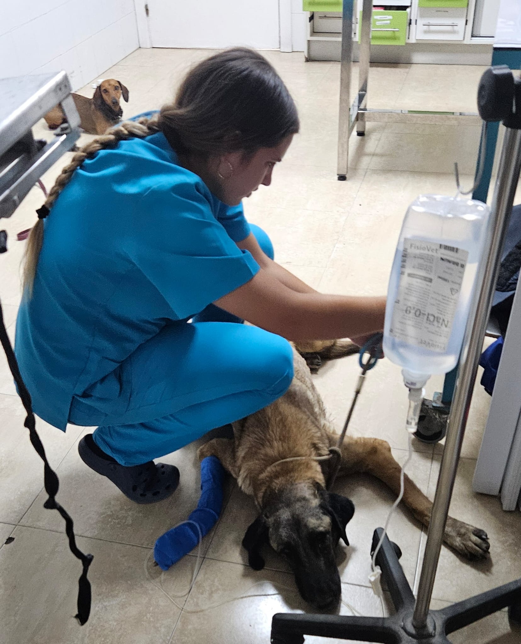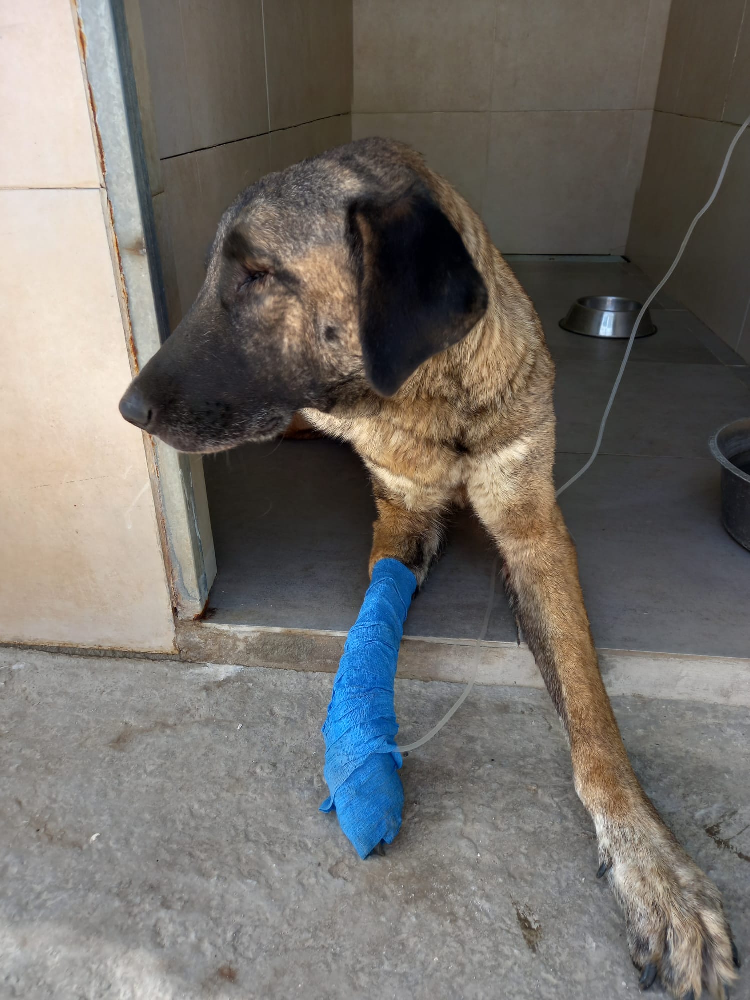 She was rushed to an emergency vets and arrived just in time. She has had two surgeries. The first to treat an infection in the wound on her leg and the second to treat Piometra. She has also been give IV fluids, antibiotics and pain relief. She is recovering well in foster.